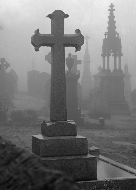 “Mist in Queensbury churchyard 31.10.2010” by Tim Green aka atoach is licensed under CC BY 2.0.